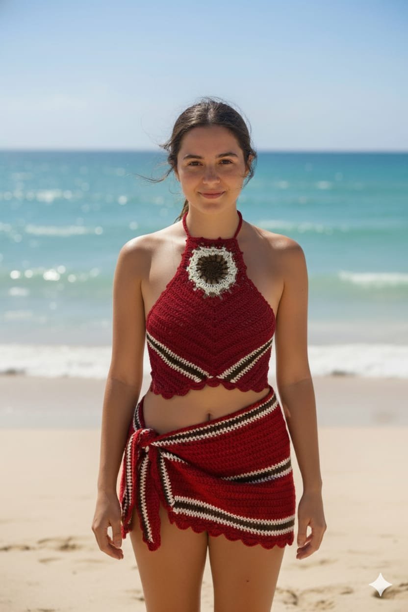 👕El diseño central en forma de pentágono resalta el arte del crochet, con un color rojo predominante que simboliza fuerza, pasión y vitalidad. Las lazadas ajustables en la nuca y la espalda permiten adaptarlo fácilmente al cuerpo, ofreciendo un ajuste cómodo y favorecedor.